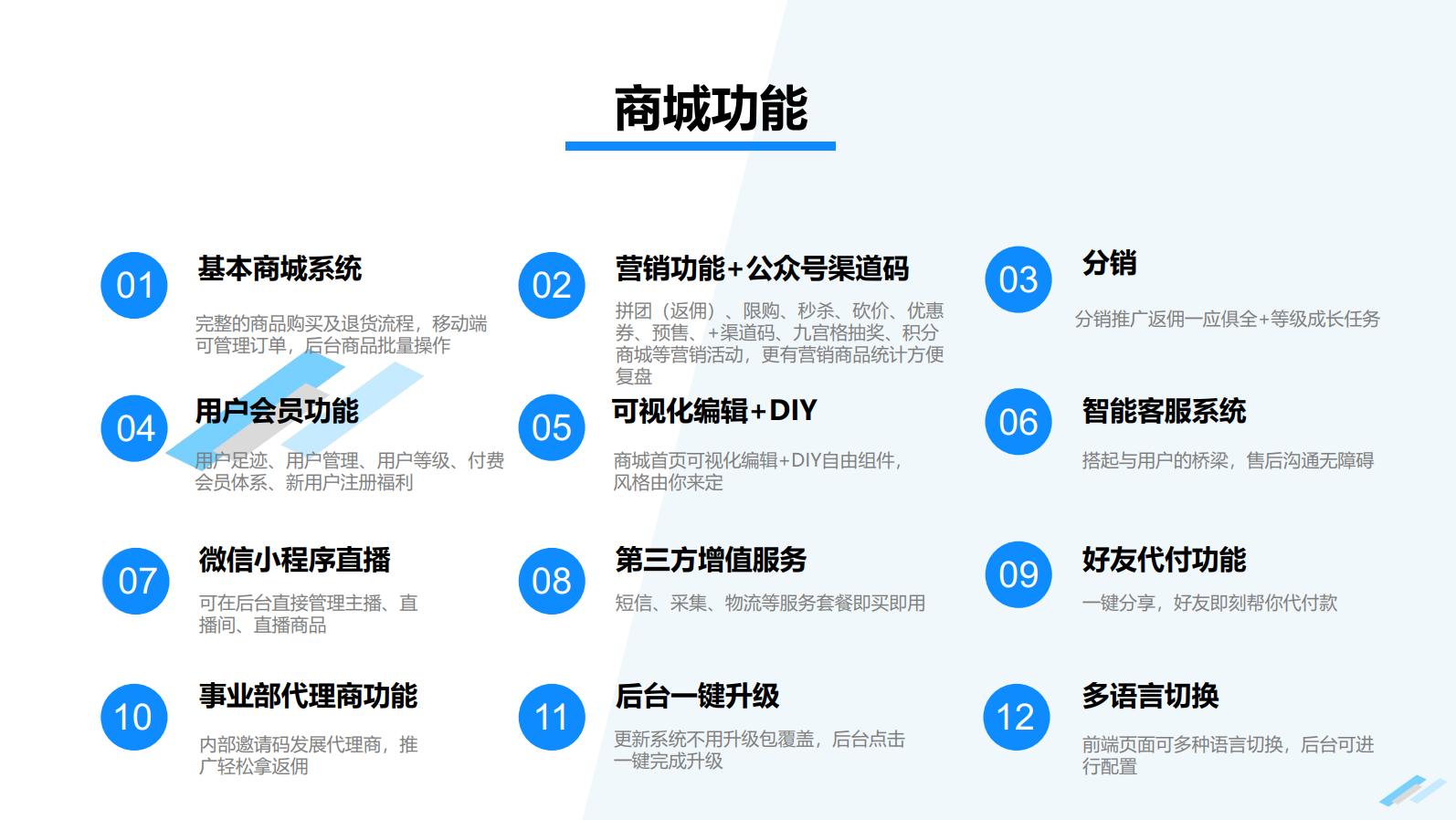 追蹤新零售模式新趨勢,打造集直播、分銷、拼團、砍價、抽獎等熱門(mén)社交電(diàn)商玩法;打通(tōng)多(duō)端用戶數(shù)據,構建全場(chǎng)景新零售社交電(diàn)商解決方案
